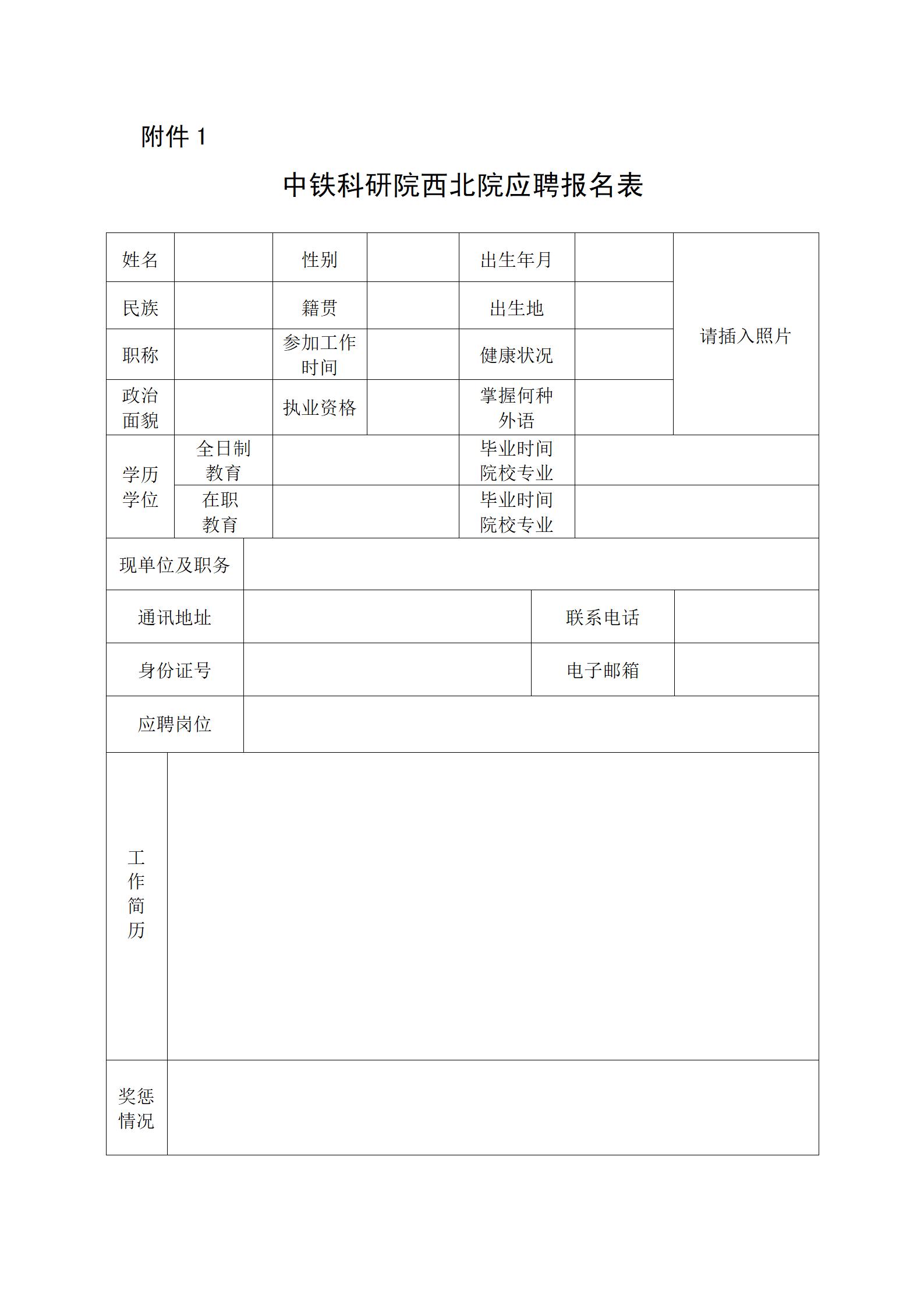 (1)《中铁科研院西北院应聘报名表》,报名表直接插入本人近期彩色电子照片,不得另附照片。